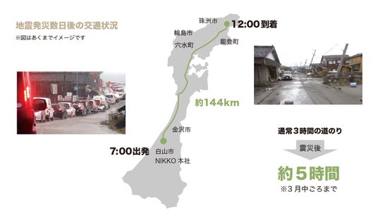 本社のある白山市から被害の大きい能登北部まで、地震の影響で道路の陥没や隆起、ひび割れが発生しているなか130km~150kmほどを移動しなければなりません。路面の積雪を溶かす融雪装置も機能しておらず、雪の降る日はさらに道路状況が悪化します。現地には宿泊施設もないため、普段でも片道3時間かかる道のりを5時間以上かけて移動する毎日が3ヶ月ほど続きました。