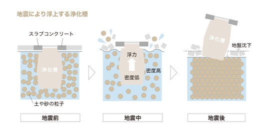 地盤は土や砂の粒子が地下水に支えられてできています。地震の振動で地下水の圧力が高まると、粒子の結合が失われて液状化が起こり、地盤が泥水のようになります。この状態では地盤の密度が浄化槽より高くなるため、強大な浮力が発生し、地上のコンクリートごと浄化槽が地上に押し上げられてしまうのです。