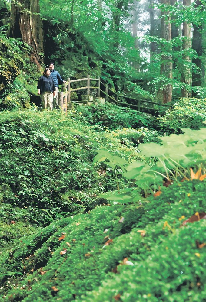 県内を旅行中という愛知県岡崎市の粉川光昭さん(64)、淳子さん(59)夫妻は「霧雨のおかげで木々やコケの緑がしっとりと幻想的な雰囲気。来て良かった」と話した。