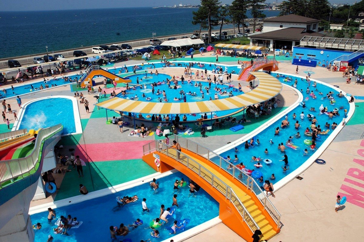県内唯一の屋外遊園地として親しまれる魚津市のミラージュランド内にあり、遊園地とプールをダブルで楽しむこともできる。1周165㍍の流れる海水プールに、高さ約10㍍からすべる三連スライダー(身長120㌢以上)を備える。幼児用プールにはすべり台もある。