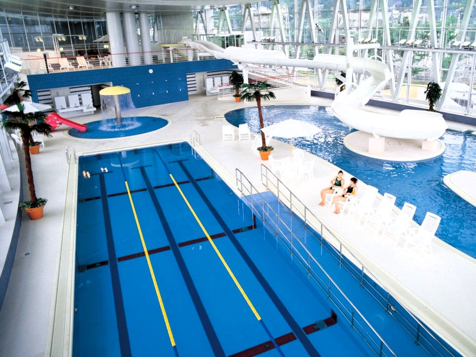 年中利用できる温水プール。プールゾーンは全面ガラス張りで、晴れた日はやわらかな光が差し込む。スリル満点のウオータースライダーや流水プールが人気。水深50㌢の子どもプールにはゾウさんの滑り台がある。託児サービスも実施しており、子育て世代のサポートも手厚い。