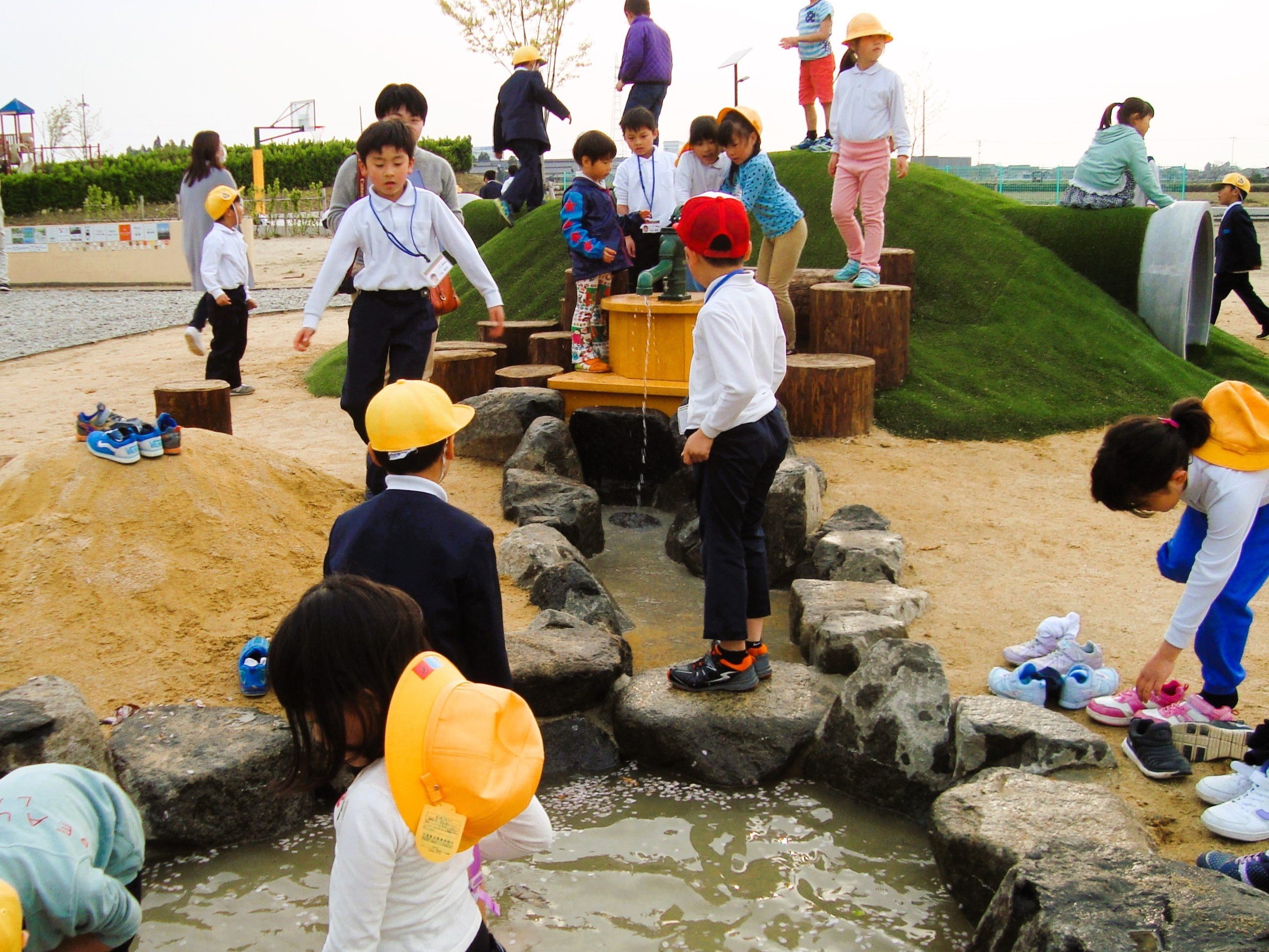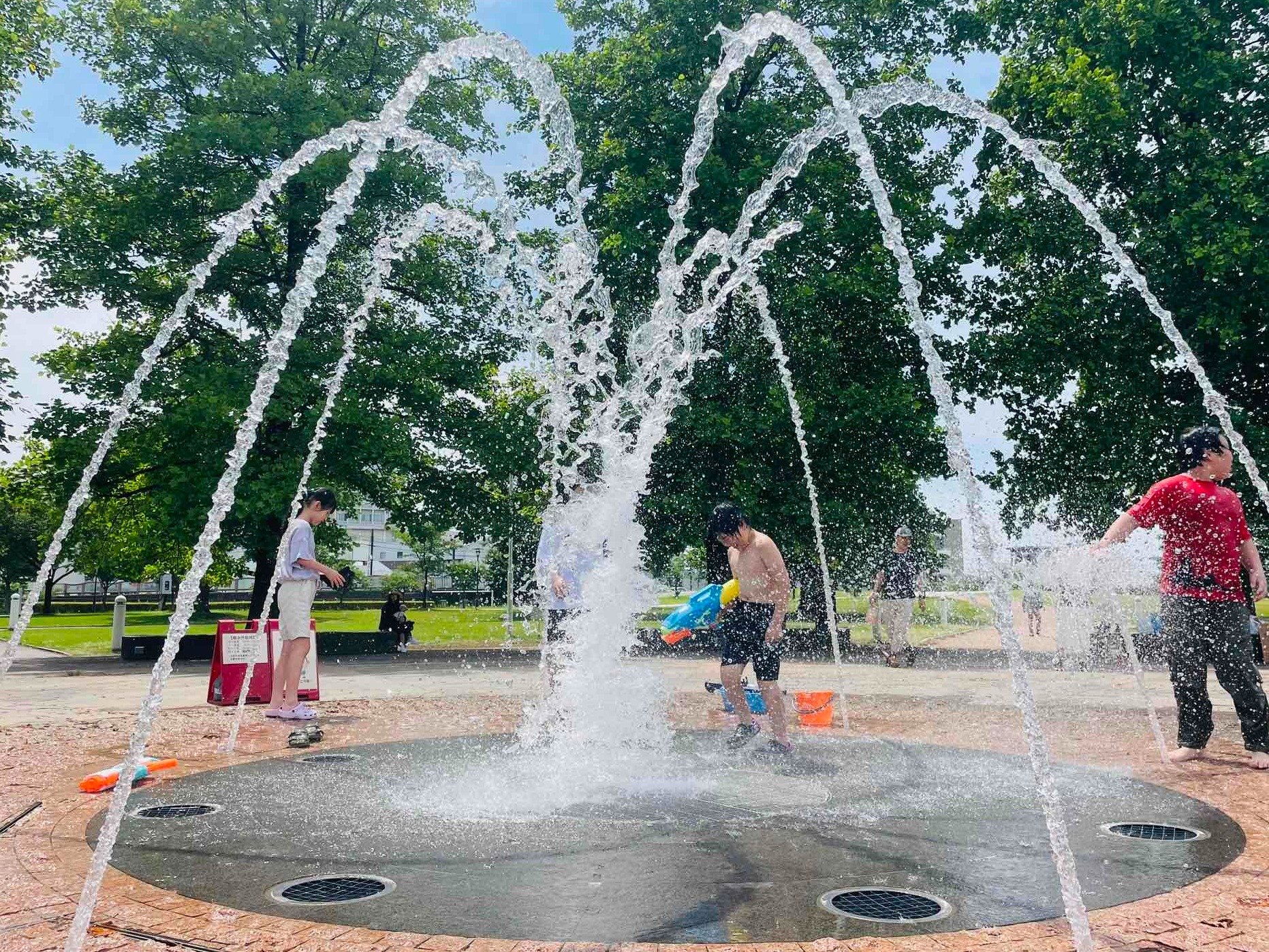 地元の小学生たちが「こども公園部長」に就任し、「遊びに来た人が、いつの間にか仲良しになっちゃう公園」のコンセプトのもと、クラウドファンディングで完成した水遊び場です。公園で毎月行われるイベントも「こども公園部長」が企画・運営しています。