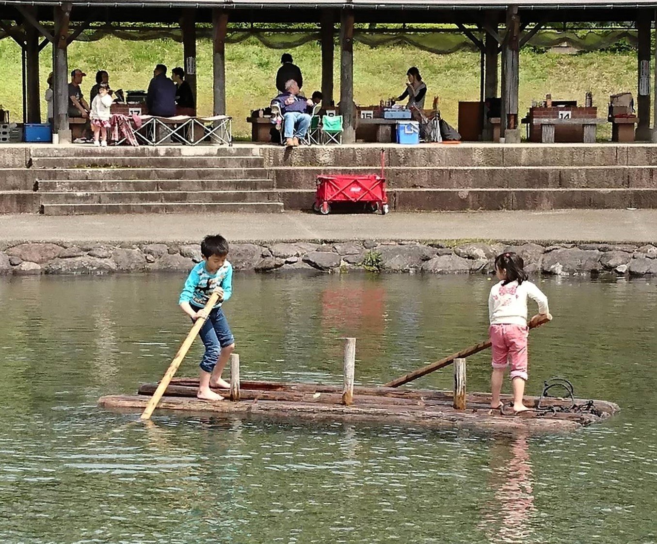 子どもだけでいかだを操って池を行ったり来たりするなどして楽しめます♪池の周りに屋根付きのバーベキュー場があるので、親はそこから見守ることができます。