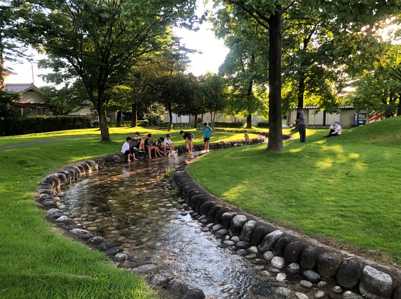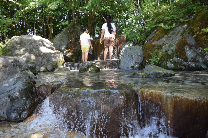 池の隣にある小川がおすすめです。ただ、川底が石でデコボコしているため転ばないよう注意です。周辺は木陰になっているので、暑い日の夕方、縁に腰掛けて足をパチャパチャさせながらの夕涼みをはとても気持ちが良いです。