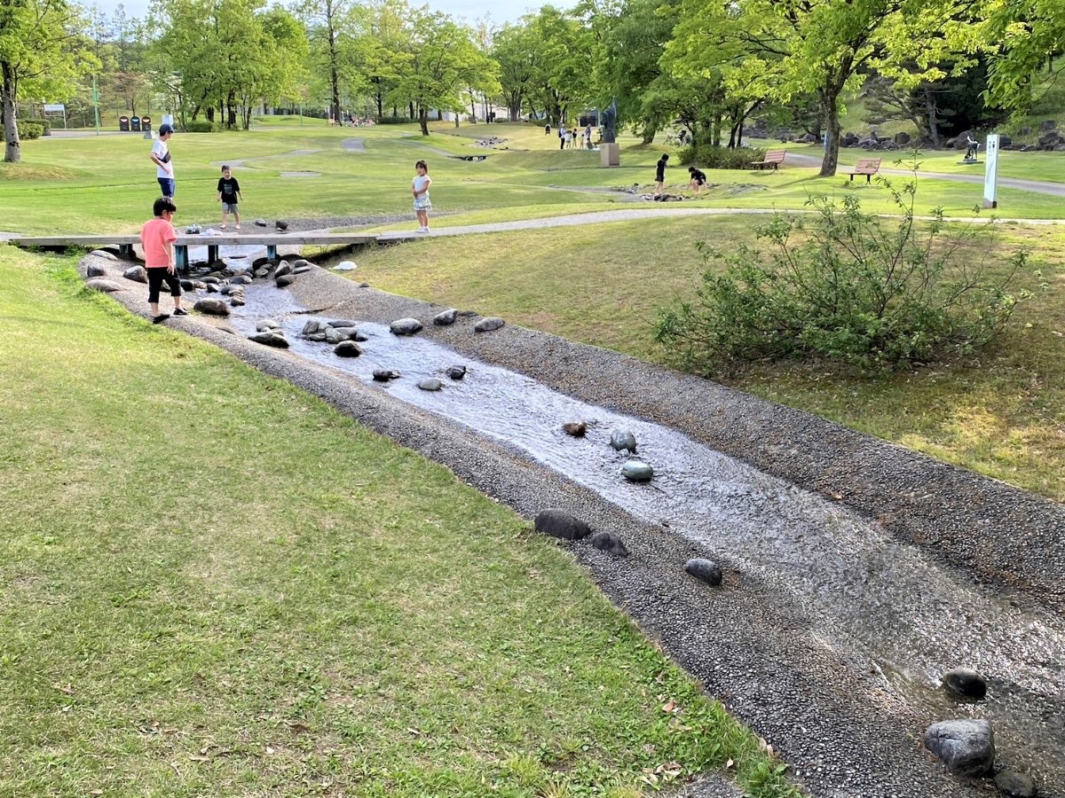 石で水の流れをせき止めてダムをつくったり、葉っぱの舟を作って競走したりといろいろな遊び方ができます。小川は長く、くねくねしていて橋もあり、ただ歩くだけでも子どもは楽しいと思います。
