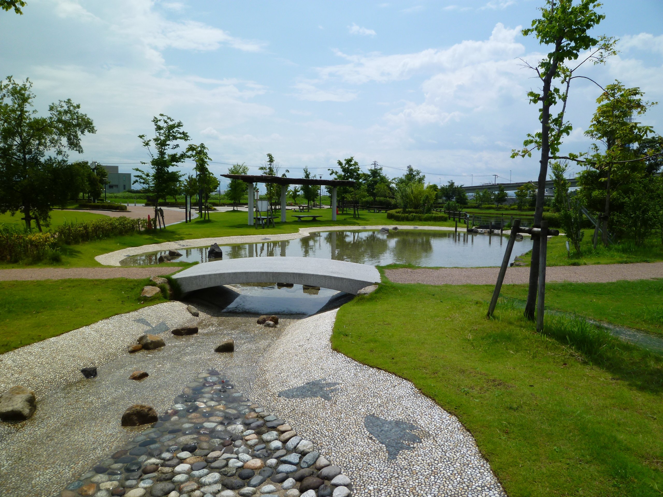 大門地域を象徴する「青目の凧(たこ)」をモチーフにした遊具のすべり台が、夏休み期間中は「ウオータースライダー」に変身する。夏になると水が張られるひょうたん池も手軽な水遊びスポットとして、多くの家族連れが訪れる。