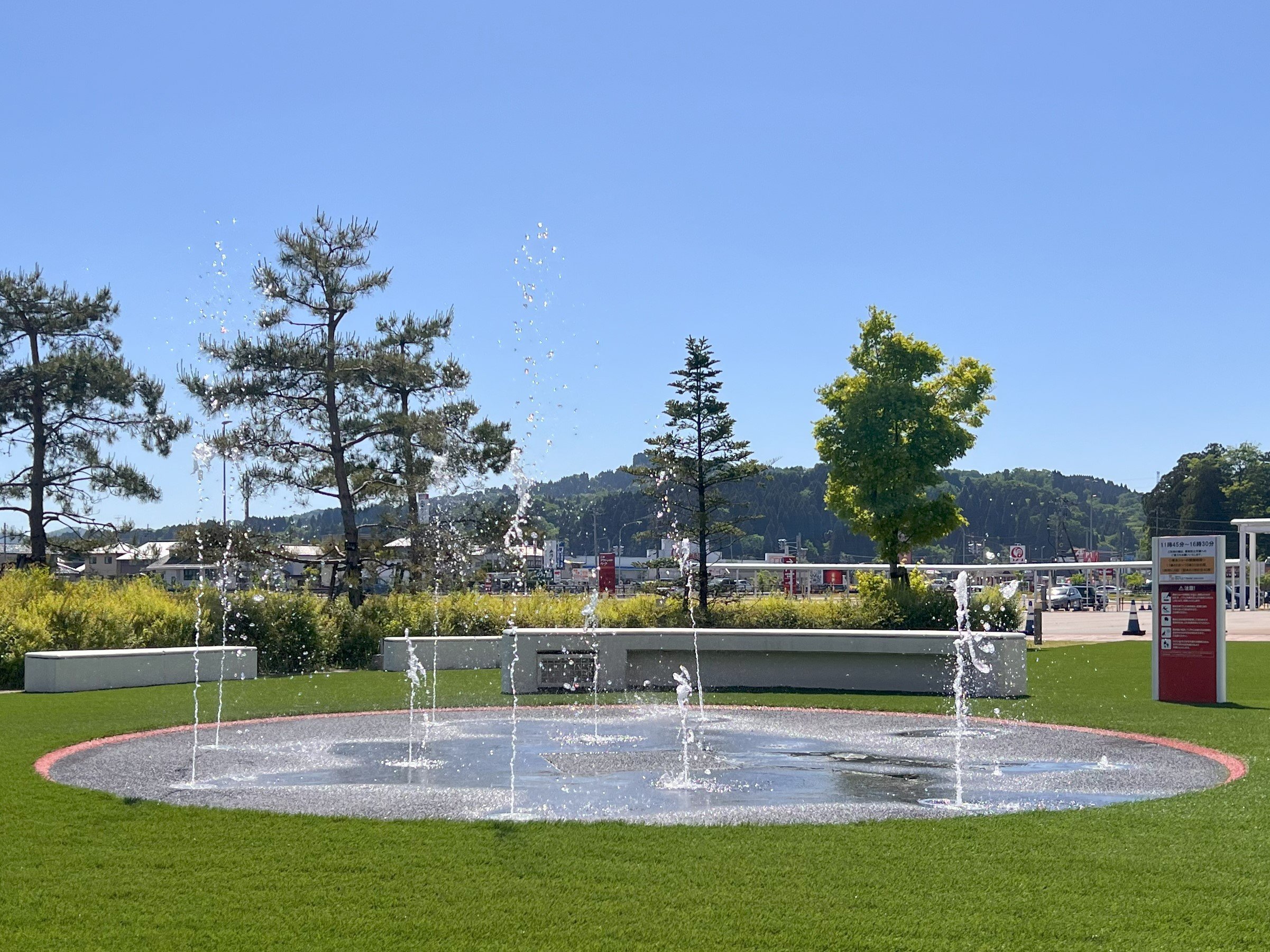 噴水パラダイスは2020年3月リニューアル。同心円状に「水のトンネル」や「水の柱」が配置され、カラフルな「クレヨンの噴水」が設置されている。親子で利用しやすいよう、休憩施設のシェルターやベンチも整備。近くの「水辺のひろば」では、日よけ用の小型テントを張って水浴びを楽しむ親子連れでにぎわう。富山平野をモチーフにした小川「せせらぎの道」も水深が浅く、小さな子でも安全に遊べる。