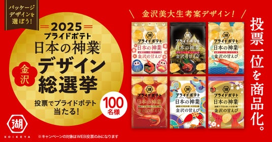 株式会社湖池屋(社長:佐藤章)は、世界から注目を集める“日本産食材の魅力”を支える匠の技と情熱の結晶である“日本の神業”を中核とした「湖池屋プライドポテト 日本の神業」シリーズより、2025年11月に発売予定の「湖池屋プライドポテト 日本の神業 金沢の甘えび」のパッケージデザインを一般投票により決定する『2025 湖池屋プライドポテト 日本の神業 金沢 デザイン総選挙』を実施します。