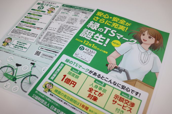 さらに「TSマーク」の利用も勧めています。これは自転車安全整備店で点検整備した自転車に貼るシールのことです。傷害保険と賠償責任保険が付帯されており、賠償責任補償額は最高で1億円。万が一の事態に備えることができます。