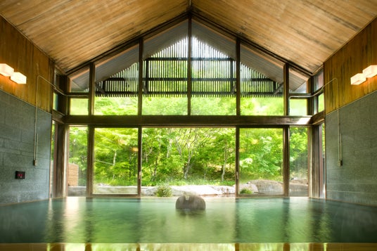 軽井沢星野エリア内にある、源泉かけ流しの立ち寄り湯です。肩まで浸かれる深い湯船の内湯と解放感たっぷりの露天風呂、ジャズの流れるサウナや水風呂を備えています。湯船には星野温泉の源泉が良質なまま溢れ、その軟らかいお湯は「美肌の湯」といわれています。
