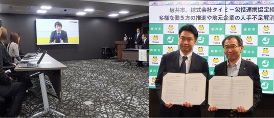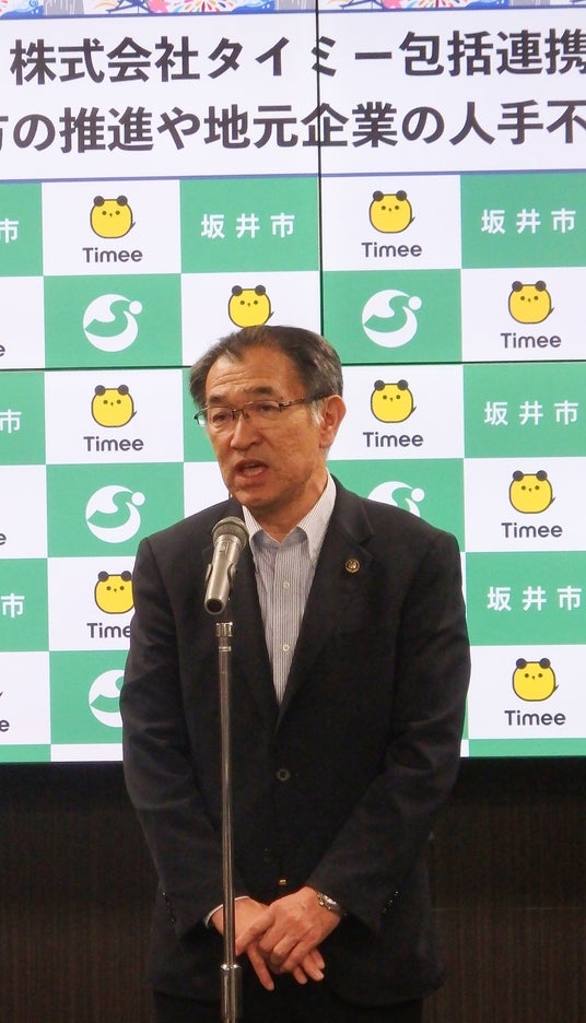 福井県坂井市は「働きたい時間」と「働いてほしい時間」を結び付けるアプリの利用ワーカーが1,000万人を超えた株式会社「タイミー」(本社・東京都港区)と5月23日に、「人材確保、雇用創出に関する包括連携協定」を結んだ。同社は地方創生を念頭に、全国の地方自治体との連携に前向きで、すでに21道府県39自治体と締結しているが、40番目となる坂井市は、福井県では初めての協定締結。池田禎孝は「働き手の高齢化や人手不足が深刻化する中、タイミー社との連携は「市民にも多様な働き方を提案できるほか、市内の団体、事業所の人材確保にもつながる」と話し、市内の雇用創出などに幅広いメリットがあると強調した。