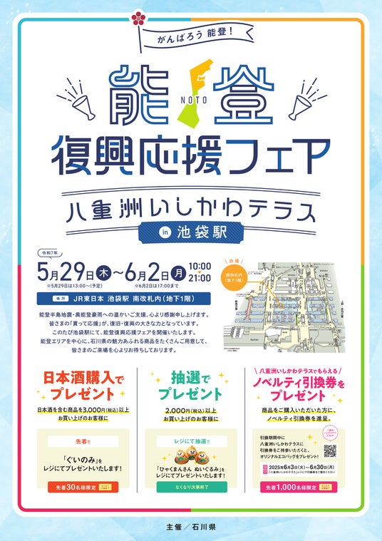 能登半島地震の応援消費の気運を継続させるため、首都圏アンテナショップ「八重洲いしかわテラス」では、今年度首都圏主要駅等において「能登復興応援フェア」を開催していくこととしており、この度、その第一弾の取り組みとして、JR池袋駅でフェアを開催します。