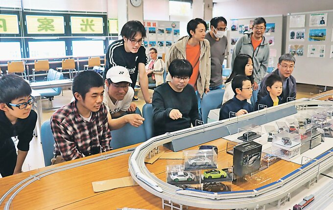 富山県のJR砺波駅周辺の活性化につなげる「砺波駅にぎわい市」が24日、同駅の砺波市コミュニティプラザで始まった。車や鉄道模型のジオラマ展示などがあり、乗り物ファンや家族連れらでにぎわった。25日まで。