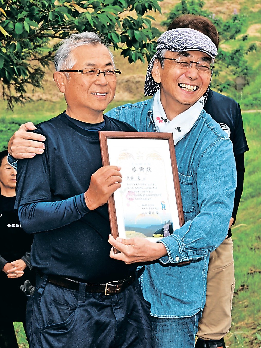 担い手不足による荒廃を食い止めるために始めたオーナー事業は27年目を迎え、ことしは県内のほか東京、神奈川、大阪などから41組が登録する。開始式で20年以上オーナーを続ける東京都練馬区の佐藤寛さん(67)に藤井隆長坂区長(71)から「長坂栄誉村民賞」の表彰状が贈られた。