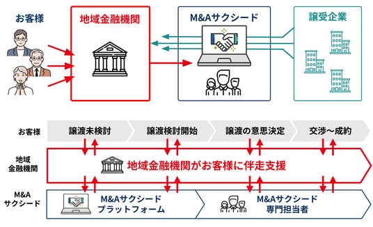 M&Aサクシードでは、M&A市場のオンライン化を通じて、M&A当事者に開かれた選択肢を提供してきました。このたび提供を開始する「地銀版M&Aサクシード」は、従来のプラットフォームや仲介会社との連携では実現が難しかった、潜在ニーズの段階から成約に至るまで、地域金融機関が一気通貫でお客様に伴走できるようにする新サービスです。