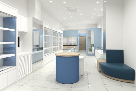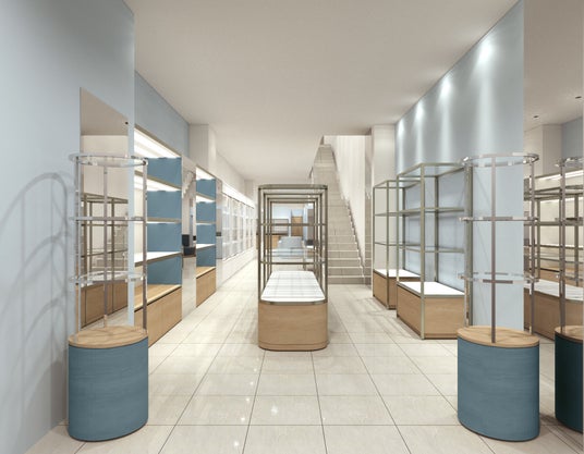 リニューアル後の店内は、水色を基調とした内装で統一し、「水」が持つ清らかさ、透明感、そして流れを表現しました。1階は気軽に入りやすく、発見の楽しさがある空間に。2階は、より落ち着いたトーンで、お客様がリラックスして商品をご覧いただける、上質なくつろぎの空間を演出します。