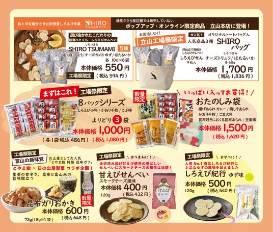 普段は店舗で販売を行っていないSHIRO SASARAYAブランドの人気商品「SHIRO TSUMAMI」シリーズを工場祭限定で販売。さらに、立山工場祭限定でSHIRO SASARAYAの人気商品3種が入ったオリジナルトートバック付きの「SHIROバック」も数量限定で販売します!
