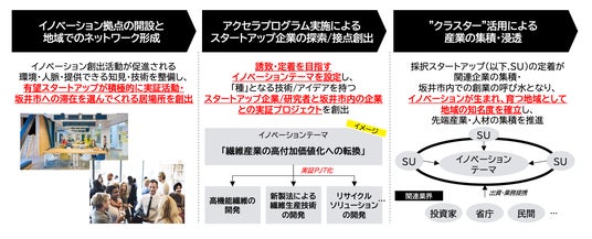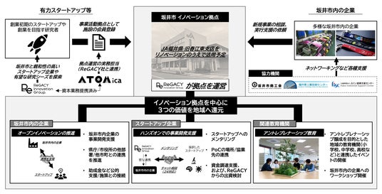 坂井市では、人口減少・高齢化・社会ニーズの変化・後継者不足などを背景に、産業規模の縮小が進む中、地域の経済的価値を高め、持続可能なまちづくりを進めることが必要となっています。こうした背景のもと、本事業では既存産業の更なる活性化と新産業の創出を行い、魅力的で良質な雇用を生み出すことを目的としています。具体的には、イノベーション拠点の整備、有望なスタートアップの発掘・誘致・伴走支援を行うことで、市内に拠点を置くスタートアップ企業の集積やオープンイノベーション創出、市内での起業・新規事業創出を目指します。