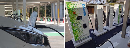 左:充電中のEV公用車 右:EMS「ぷらマネ(R)︎リンク」で制御している蓄電池付きV2Xおよび50kW急速充電器