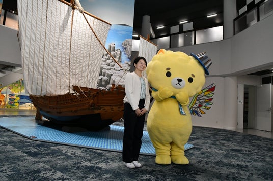 坂井市龍翔博物館の見学の際は、森澤区長は、坂井ほや丸と記念撮影でパチリ