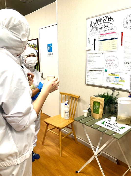 当社は、全社員に熱中症予防と熱中症発症時の行動指針を示す等して対策の周知を徹底し、必要に応じて熱中症対策品を支給しています。また、最も気温が高くなりやすい食品製造工場においては、労働時間として水分補給休憩を設けるなど、水分をとる意識づけを行っています。加えて作業場にティーサーバー、冷風スポットを増やすなど、環境整備に取り組んでいます。