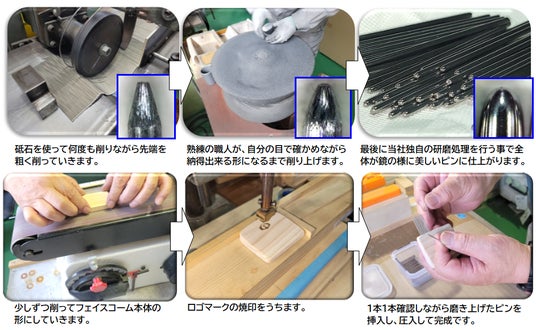 百年以上前から続く「氷見針」製造で培った研磨技術を人へのやさしさにも活かせないか、という従業員の思いから5年前の2020年、【つるかめ印のビューティーコム】が誕生致しました。少しずつ愛用者が増えて来た時、あるお客様から「自分が使ってみて良かったから、うちの子(ペット)用も作ってほしい」とのお声を頂いて、2年後の2022年、ペット用として【つるかめ印のわんにゃんコーム】を発売致しました。そして昨年、2024年にはデザインや機能性を高めてより取扱い性に優れた【StainlessWoodComb(ステンレスウッドコーム)】シリーズも新たに加わりましたが、別のお客様からは、「これまでのコームだと顔周りをするにはちょっと大きすぎる」「目に当たりそうで怖い」「光るピンを嫌がってしまう」というご意見を頂きましたので、これまでの製品同様、これまで培ってきた【真っすぐ磨く】研磨技術を活かした品質はそのままに「コンパクトで安心して使える製品」をコンセプトとした【つるかめ印のわんにゃんフェイスコーム】を開発致しました。