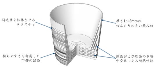 結露しにくく断熱性の高い内部構造と手にフィットする外側の凹凸形状、そこに漆の抗菌性をプラスしています。