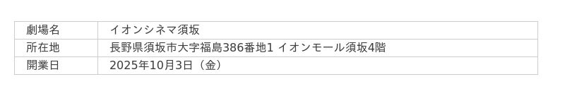全国に「イオンシネマ」97劇場を運営するイオンエンターテイメント株式会社(本社:東京都港区、代表取締役社長 藤原信幸)は、甲信地方(長野県、山梨県)初※となるIMAXシアターを含む全9スクリーンを備えた映画館として、「イオンシネマ須坂」を2025年10月3日(金)に開業いたします。本劇場は、同日にオープンする大型商業施設「イオンモール須坂」内に開設するもので、映画館のみならず、ショッピングや食、エンターテイメントが一体となった空間の中で、地域の皆さまに日々がワクワクする感動体験をお届けします。