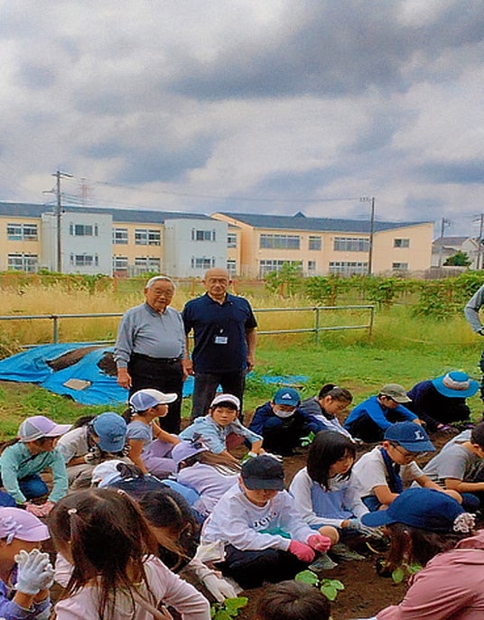 ▲チャレンジスクールの活動で、子供たち、保護者、地域ボランティアとともに野菜の種をまいている様子、画像左よりチャレンジスクール運営会議会長 溝口誠氏、当社取締役 西郡文啓