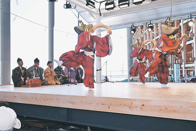 地域に根差す伝統を次世代に伝える「伝統文化未来共創プロジェクト」の一環で、岩崎会長をはじめ保存会の15人が出演。演じ手がささらを小気味よく鳴らしながら舞う姿に、舞台を囲んだ観客が見入った。英語で解説したほか、来場者にささらを鳴らす体験を楽しんでもらった。
