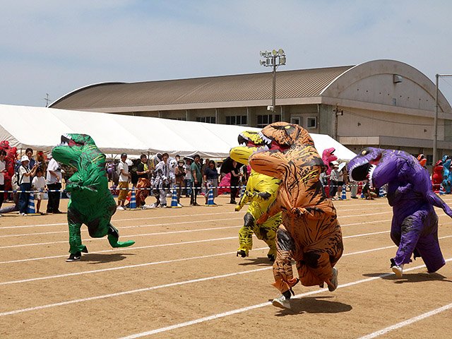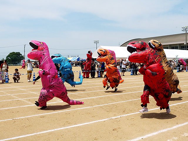 恐竜の化石が発見された富山市大山地域の特色にちなんだイベント「大山ダイナソー祭り」が7日、同市上滝中学校で開かれた。恐竜の着ぐるみ姿で走る「ティラノサウルスレース」に地域住民ら約140人が参加し、会場を全力で駆け抜けた。