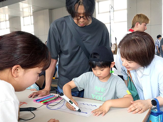 樹脂などをペン先から押し出し、立体物を描ける「3Dペン」を使ったワークショップもあった。富山大芸術文化学部の学生が開き、子どもたちが電車の絵などを丁寧に描いた。