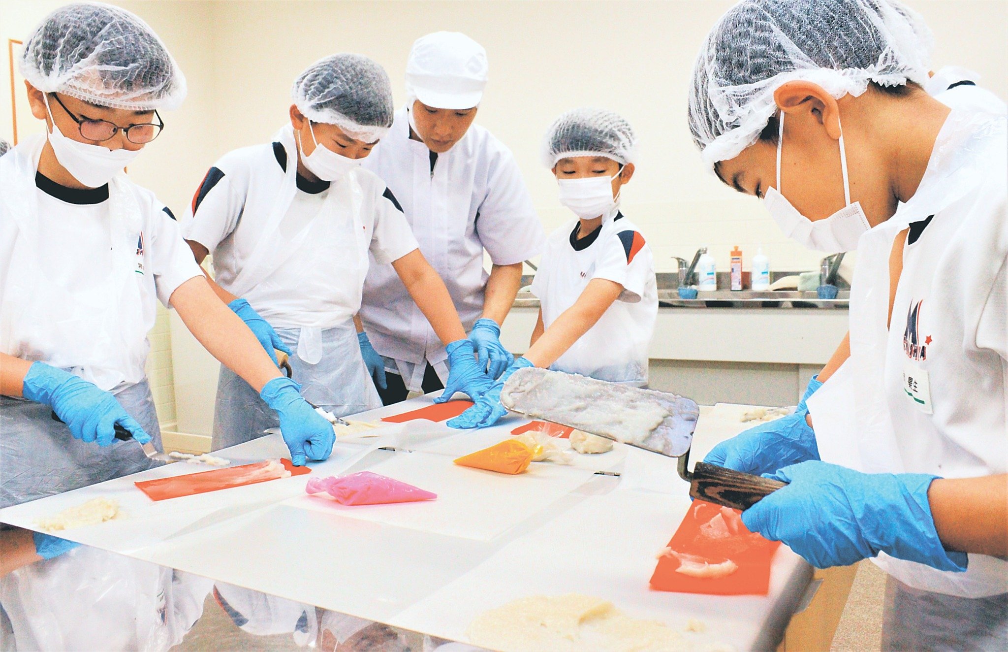 道下小学校での授業には4年生30人が参加した。中村蒲鉾(魚津)、尾崎商会(同)、広又蒲鉾商店(高岡)の職人が講師を務め、かまぼこの作り方を実演した。その後、児童はかまぼこ作りを体験。職人が使うコテや「つけ包丁」を用い、赤く色づけして焼いたすり身シートの上に白いすり身を乗せて、ぐるぐると巻いた。佐々木美織さん(9)は「すり身をきれいに乗せていくのが難しかったけど、上手にできた」と笑顔を見せた。