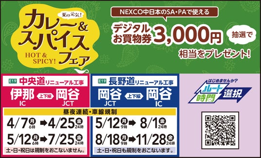 中日本エクシス株式会社 信州支店 (長野県松本市、支店長・柳田(やなぎだ) 真(まさ)典(のり))は、E20中央自動車道(中央道) 諏訪湖サービスエリア(SA)(上下)・中央道原パーキングエリア(PA)(上下)、E19長野自動車道(長野道) 梓川SA(上下)・みどり湖PA(上下)において、2025年6月12日(木) から7月31日(木) の期間、「夏の元気!カレー&スパイスフェア」を開催します。