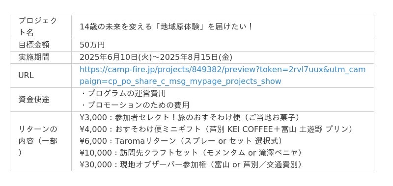本クラファンでは、支援者がプロジェクトの一員として関われる返礼品をご用意しています。旅の“空気”を届けるおすそわけ便、参加者の名前入り修了証、現地でのオブザーバー参加、対話つき報告会などを通じて、単なる支援にとどまらず「一緒に育てる」感覚で関わっていただけます。2025年は、富山は8/17(日)-23(土)、北海道 芦別は9/14(日)-20(土)に開催決定です。