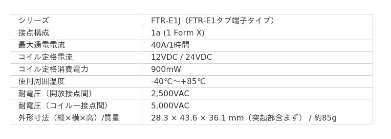 FTR-E1Jシリーズは#250タブ端子を搭載し、20A 800VDCまたは10A 1,000VDCの高電圧直流開閉が可能でありながら、900mWの低コイル消費電力を実現しています。