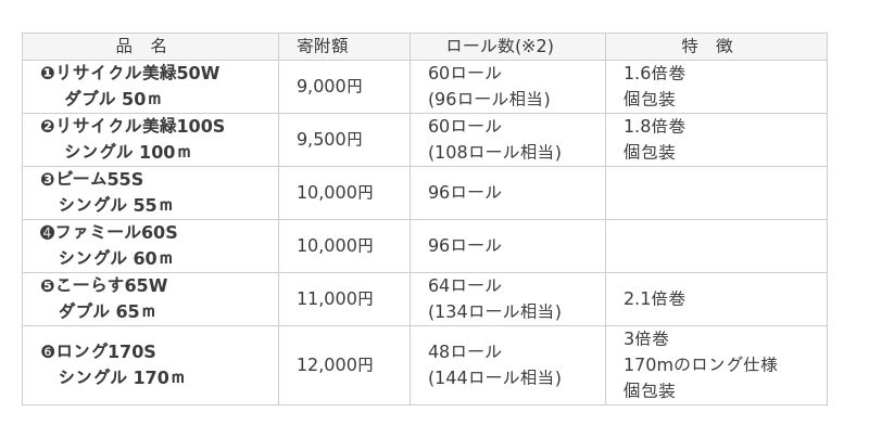 今回出品するトイレットペーパーは、関市武芸川町(せきしむげがわちょう)にある美濃桜製紙株式会社(みのさくらせいしかぶしきがいしゃ)で製造しています。岐阜県内から回収された古紙を75%使用し、再生紙100%でつくられた、環境に配慮したエコマーク認定製品です。限りある資源を大切に使いながら、持続可能な社会づくりに貢献しています。ラインナップ(寄附金額順)