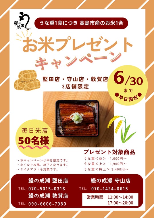 フランチャイズ本部や加盟店への支援を行うフランチャイズビジネスインキュベーション株式会社(本社:滋賀県高島市、代表取締役社長:山本昌弘)がオーナー制に基づき運営する「うまい鰻を腹いっぱい!」をコンセプトにした鰻専門店「鰻の成瀬」は380店舗を超える鰻チェーンとなりました。ご愛顧いただきましたお客様へ感謝の気持ちを込めて、6月11日から6月30日まで平日限定で毎日先着50名様にうな重1食につき滋賀県高島市産のお米を1合プレゼントするキャンペーンを実施します。対象店舗は、堅田店・守山店・敦賀店です。