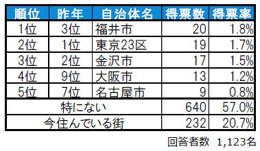 住みたい街は、1位福井市、2位東京23区、3位金沢市。