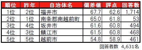 3位~5位は、1位の福井市周辺に位置する自治体(鯖江市・坂井市・越前市)で、昨年に引き続きトップ5に並ぶ結果となっています。