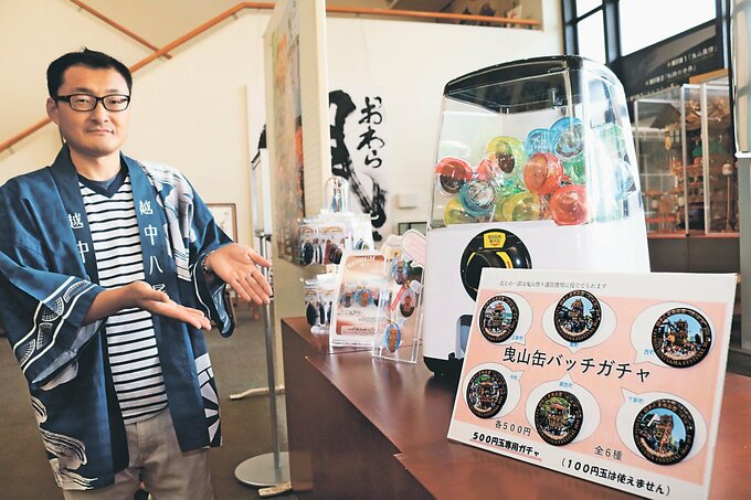 缶バッジは直径5・7センチ。6種類あり、6町の曳山をそれぞれモチーフにした。カプセル玩具の販売機のハンドルを回すと、1個出てくる。1回500円。