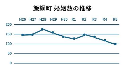 飯綱町では、移住者向け助成や子育て支援等の充実により、2024年に町発足以来初めての社会増(転入超過)となりました(※図1.)。助成事業の拡充や飯綱町の魅力を発信し続けることで、社会増が実現した一方、飯綱町の婚姻数は年々減少傾向にあります(※図2.)。