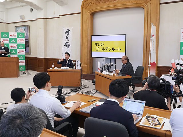 新田知事は「両自治体は距離が離れている。JR西日本も加えて、3者で連携したい」と話すと、武内市長は「両自治体を結ぶ線を『すしのゴールデンルート』とし、ほかの地域や企業も巻き込んで取り組みの輪を広げてはどうか」と提案。新田知事は「乗ります!」と即答した。