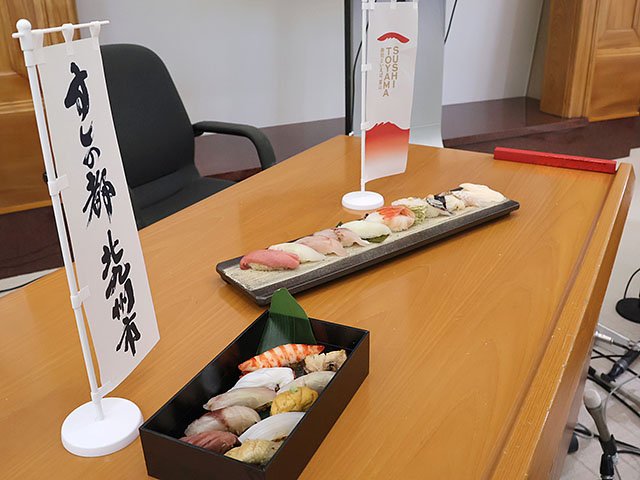 会談で武内市長は「駅に降りた時からすしの王者の力を肌で感じた。率直に意見交換したい」と、北九州のすし折を贈った。新田知事は「取り組みが少し早かっただけで王者とは思っていない。せいぜい兄貴分ということでお願いします」と返し、富山湾ずしを振る舞った。