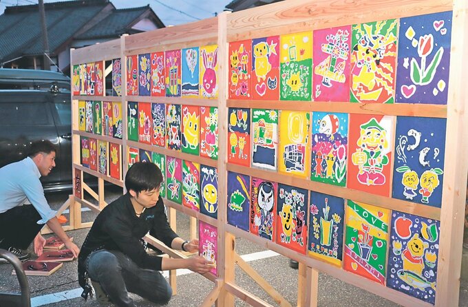 トッペ行燈は5月に開いた制作体験会で、親子約120人が「砺波の好きなところ」をA4サイズの和紙に表現した。今月11日夜には同青年部文化・創出委員会のメンバーが縦約2メートル、横約4メートルの枠組みに、チューリップタワーや熱気球などをカラフルに描いた作品を並べて照らし、完成形を確認。13日に会場の同青年部のブースに設置し、優秀作品も決める。