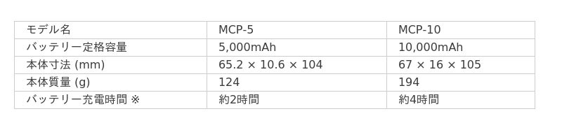 今回発表する新製品ラインナップは以下の10機種です。MCP-5 シリーズ (バッテリー容量:5,000mAh)