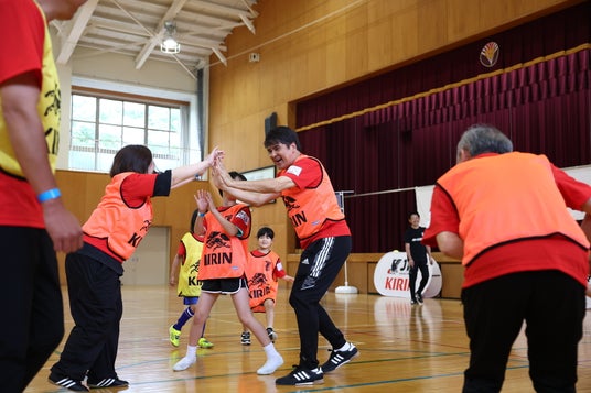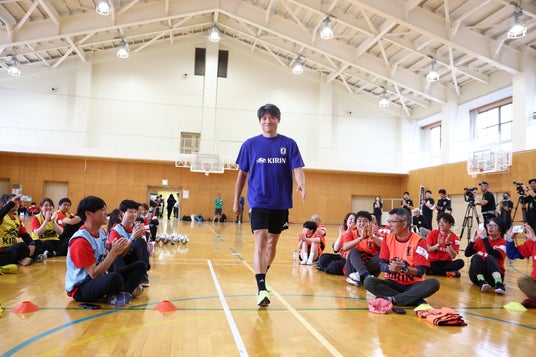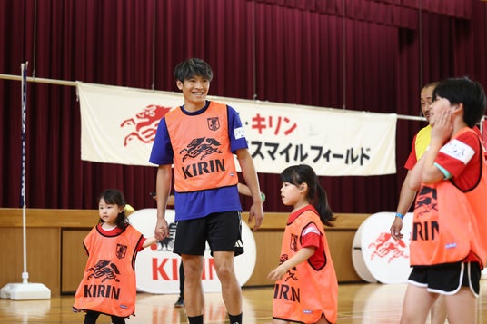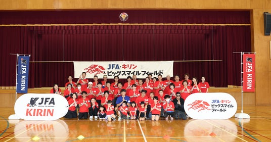 キリンホールディングス株式会社(社長 COO 南方健志、以下キリン)と、公益財団法人日本サッカー協会(会長 宮本恒靖、以下JFA)は共同で、2024年1月1日に発生した能登半島地震の復興応援プロジェクト「JFA・キリン ビッグスマイルフィールド」を昨年5月から継続して実施してきました。今回はその第7回目として「JFA・キリン ビッグスマイルフィールド in輪島市町野地区」を6月14日(土)に石川県輪島市立東陽中学校にて開催しました。開催地域の輪島市町野地区では、サッカー日本代表の町野修斗選手と地区の名前が同じというご縁から、兼ねてより地区をあげて町野選手の応援に取り組んでいます。その熱がこもった応援は町野選手ご本人にも届いており、この度初めて町野選手がサプライズでの現地訪問が実現しました。当日は元サッカー日本代表の永島昭浩さん、中西永輔さんもゲストとして登場し、老若男女で楽しめる “歩いて行うサッカー“ウォーキングフットボールや交流会を通して、被災地に笑顔を届けました。町野選手をずっと応援されていた、町野地区から参加の50代の女性は満面の笑顔で「応援していた町野選手に来場いただけるなんてびっくりでした。本当に嬉しかったです!」といった感想や、小学1年生の女の子は「おじいちゃんと一緒にできて楽しかったです。またやりたいです」など笑顔でお話しをいただきました。