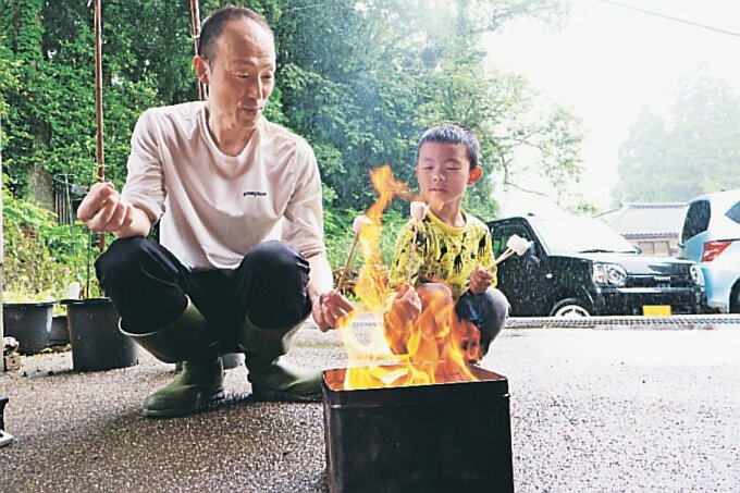 上市町は15日、上市町東種の旧白萩南部小学校で体験型イベント「今日だけ原始人?!~五感で楽しむ火おこし体験!~」を開いた。親子連れら8組が参加し、協力して火おこしを体験した。