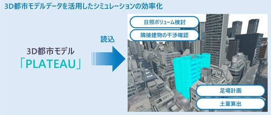 - 国土交通省の推進する「PLATEAU」のデータの読み込みへ対応。3D都市モデルデータ(CityGML)を日照ボリューム検討や隣接建物の干渉確認、仮設計画などへ活用可能。