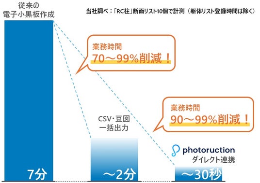 - 躯体リストから小黒板に必要な情報(CSV)と豆図を整合のとれた形で出力可能。出力したデータを各社の電子小黒板システムに取り込むことで、電子小黒板の作成にかかる作業時間を従来から7割削減。(※1)